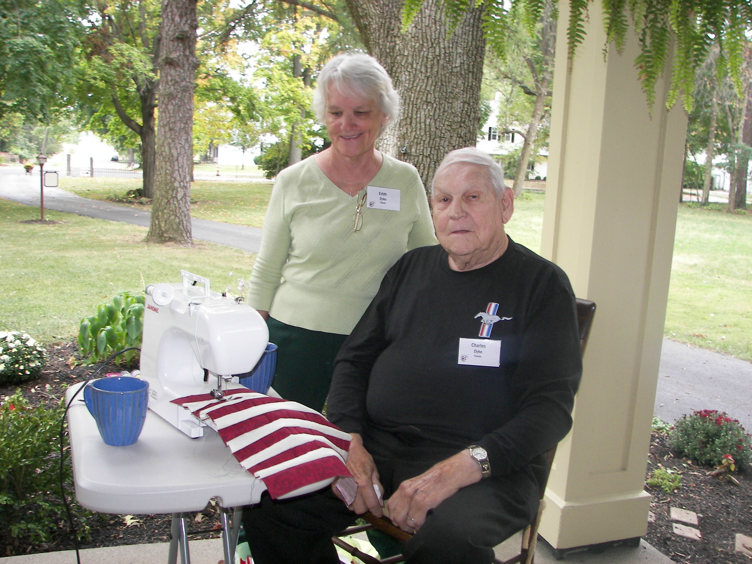 Edith and Charles Dyke, with the beginnings of his next American flag quilt, on the porch of the High Street Manor Bed and Breakfast.