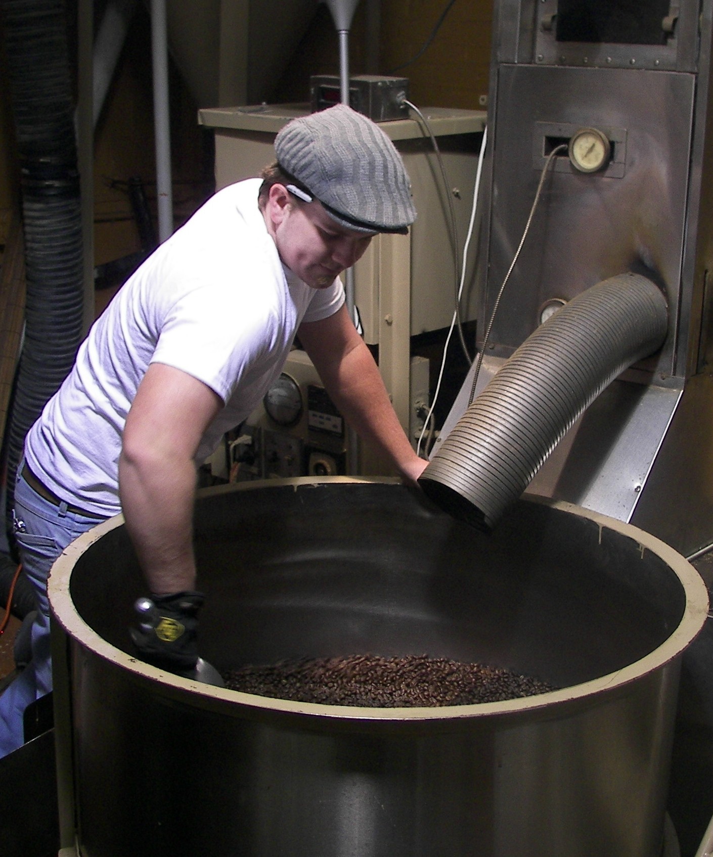 Hans roasts coffee at Hemisphere Coffee Roasters.