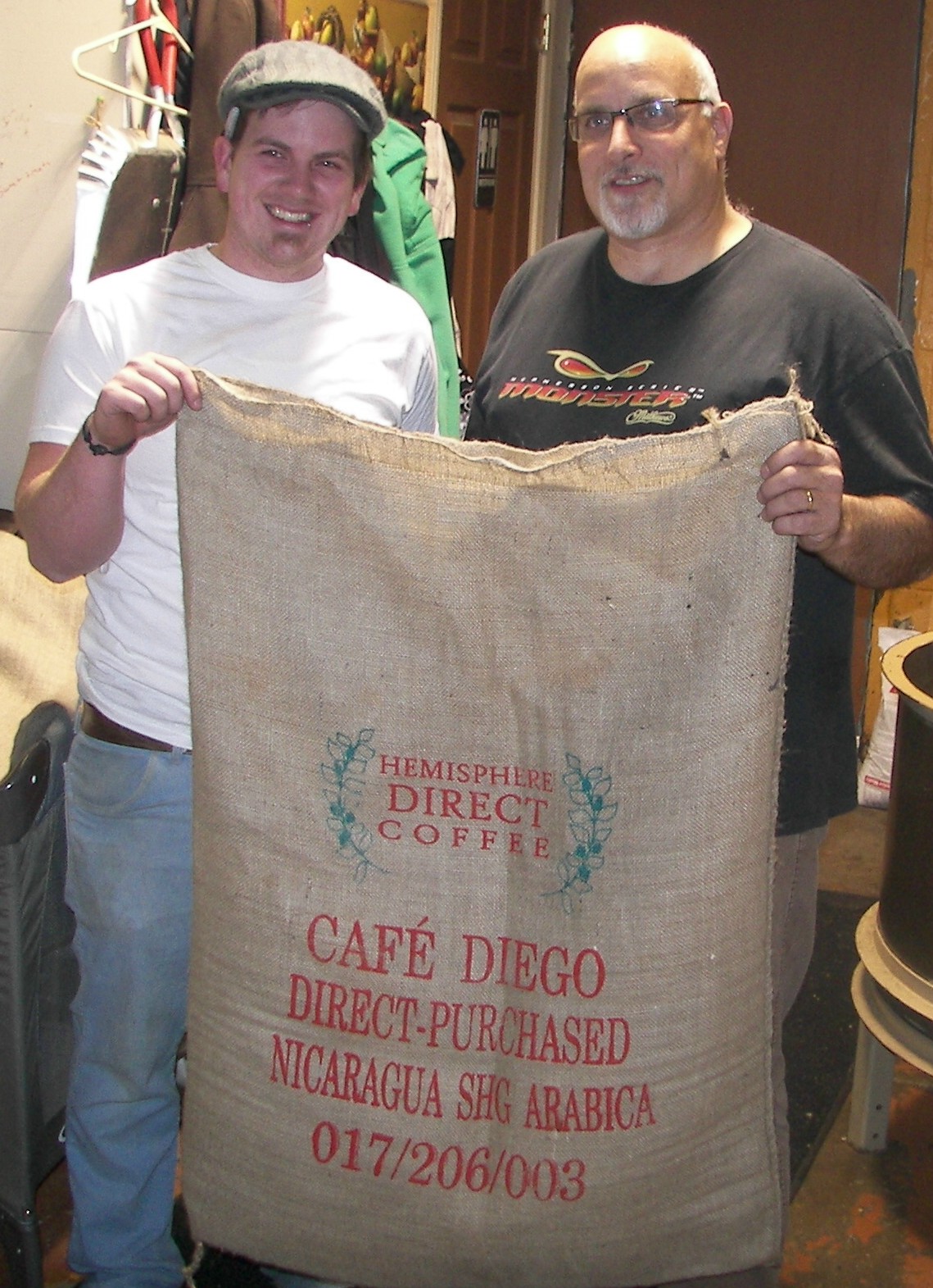 Paul Kurtz and his son-in-law Hans Hochstedler display a bag of Cafe Diego, coffee they purchased directly from a farmer in Nicaragua.