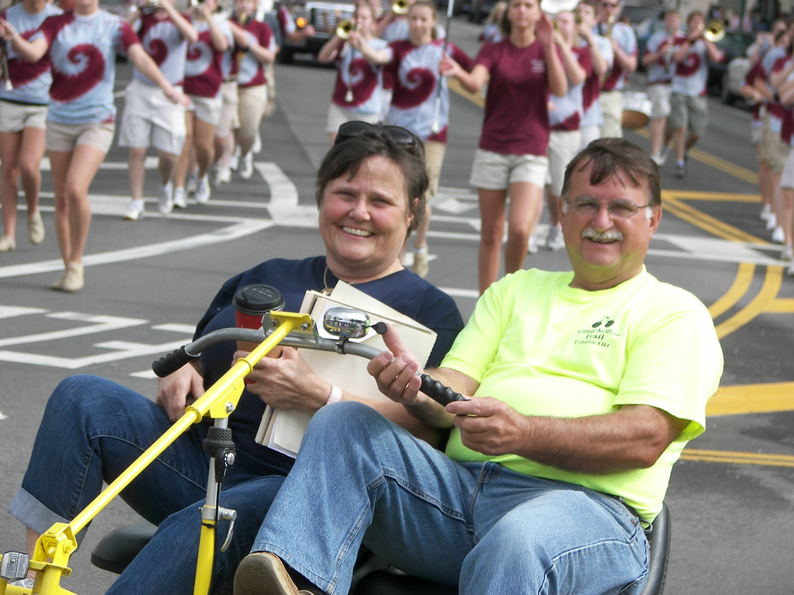 Nancy Lokai-Baldwin, president of the Simon Kenton Pathfinders, rides with her husband, Frank, in Urbana's Springfest Parade in May, in celebration of National Bike Month.